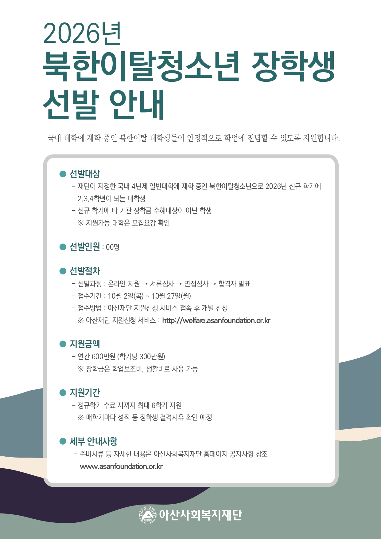 fnctId=bbs,fnctNo=145 2026년 아산재단 북한이탈청소년장학생 선발 안내 작성일2025.10.15 수정일2025.10.15 작성자 김*린 조회수183 첨부파일 첨부파일이(가) 없습니다.