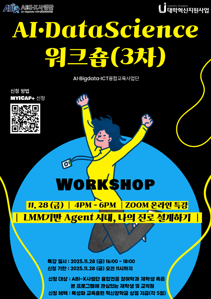 우리 대학교 대학혁신지원사업 ABI-X사업단 비교과 프로그램 학생활동 지원 일환으로 현재와 미래산업화 선제적 대응 및 학생들의 전공 분야 지식 함양, 산업체 동향 파악, 직무역량 강화를 위해“2025학년도 AI·Data Science 워크숍(3차)”을 다음과 같이 진행하오니, 관심 있는 재학생 및 교직원의 많은 참여 신청 바랍니다.
